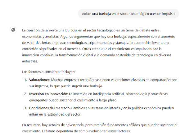 Chap GPT nos dice que hay una serie de factores que pueden influir en determinar si un determinado activo está en burbuja o no. Se refiere a las valoraciones, la inversión en innovación y a las condiciones de mercado, refiriéndose esta última a la macroeconomía global.