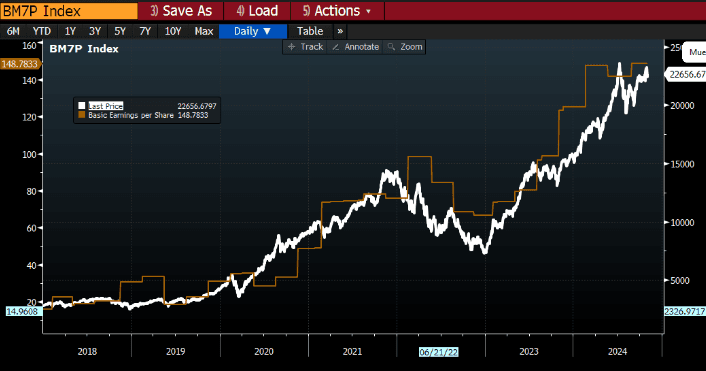 La realidad es que los conocidos como los 7 Magnificos: Apple, Microsoft, Alphabet, Amazon, Nvidia, Meta y Tesla  han seguido en lo que respecta a sus cotizaciones bursátiles al crecimiento de beneficios en los últimos 10 años, lo que elimina la idea de que hayan vivido en una burbuja bursátil no sustentada por beneficios empresariales, y por ausencia del crecimientos, y nos aleja de la fase de Especulación.